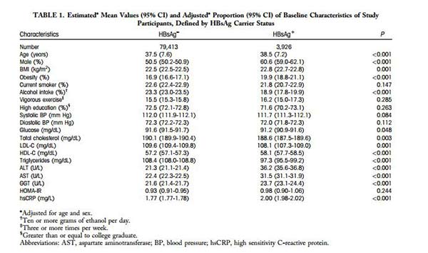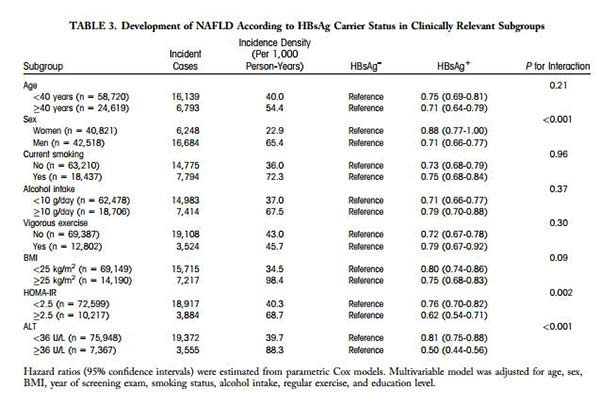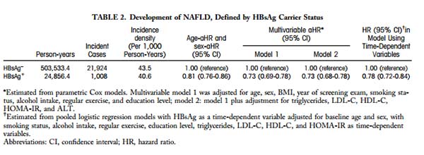 这是来自韩国首尔成均馆大学的Eun-JeongJoo等人的研究成果。他们进行了一项队列研究,旨在研究对于非酒精性脂肪肝的患者发病率,其在HBV阳性和阴性的患者中是否有不同。