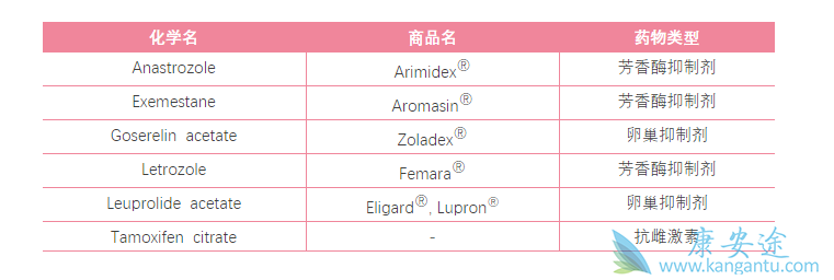 下表中列举了目前美国市面上常用的针对III期乳腺癌的激素治疗药物: