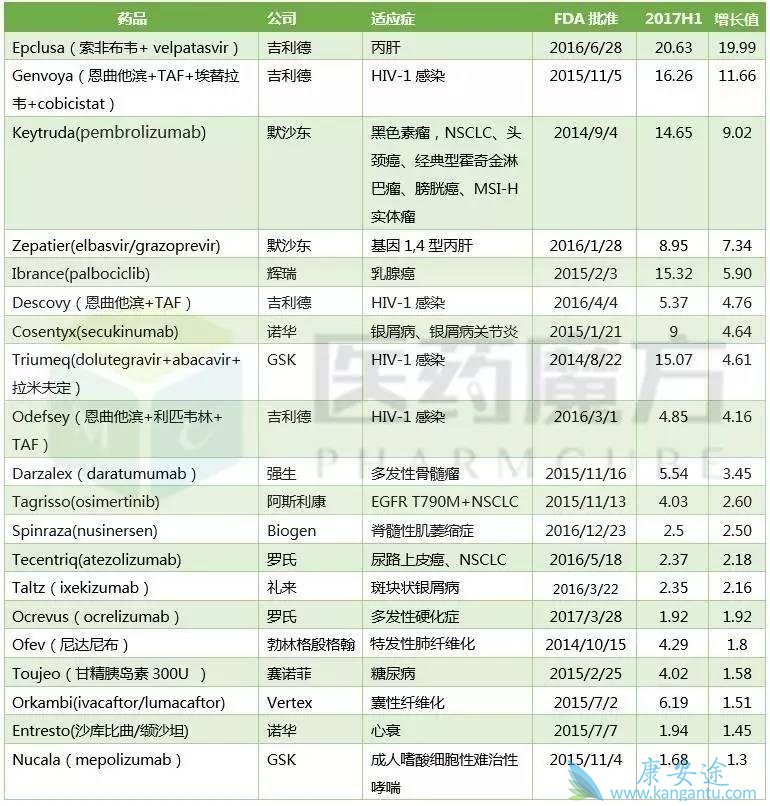 2017上半年,有不少药物给我们留下了深刻的印象。既有老而弥坚的Humira依然以近20%的增速冲刺200亿的药物史销售神话,也有Keytruda厚积薄发,大幅缩小与竞争对手的差距,还有Spinraza这样的新秀,以昂贵孤儿药身份开辟出大市场,让人惊叹不已。本文主要挑选20个在2017H1取得较好市场表现的新药(FDA批准上市时间不满3年)做一点评。