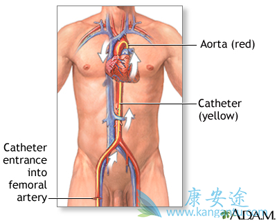 当患者清醒和无痛(局部麻醉)时,将导管插入腿部(股动脉)顶端的动脉。该程序开始于医生将一些局部麻醉注射到腹股沟区域,并将针头插入股动脉(从心脏沿腿部延伸的血管)。一旦插入针头,将引导线穿过针头放入血管。在该步骤之后,引导线留在血管中并且针被移除。然后将称为导引器的大针放置在导丝上,并且导丝被移除。