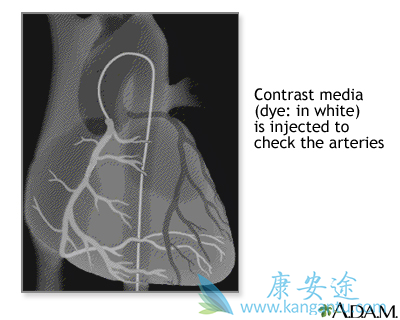 一旦导管已经定位在冠状动脉起始处,则注射造影剂并且采取一系列X射线(膜)来检查动脉中的任何变化。之后,取出导管并完成该过程。