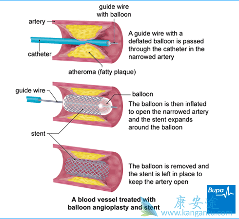 在大多数情况下,植入一种支架,它是一种管状形状的小型不锈钢网,可用于支架动脉壁以保持其开放。将支架卷曲在气囊上,用于将其展开在动脉的内壁上。当气囊膨胀时,支架膨胀压靠在动脉壁上。这有助于打开新扩大的动脉。然后将气囊放气并取出,使支架留在原位。在过去几年中,我们看到了特殊支架的发展,称为“药物洗脱”支架,其表面有药物。这种药物进入动脉壁,它是脚手架,试图提高手术的长期成功率。