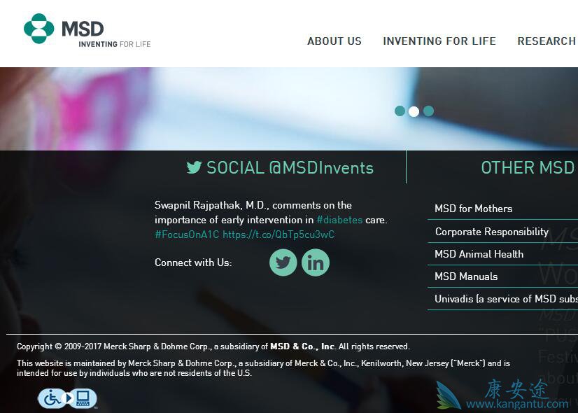 This website is maintained by Merck Sharp & Dohme Corp., a subsidiary of Merck & Co., Inc., Kenilworth, New Jersey ("Merck") and is intended for use by individuals who are not residents of the U.S.(该网站由默克公司的子公司默克公司(默克公司)的子公司默克公司负责,其目的是为非美国的居民提供服务。)msd.com的版权说明