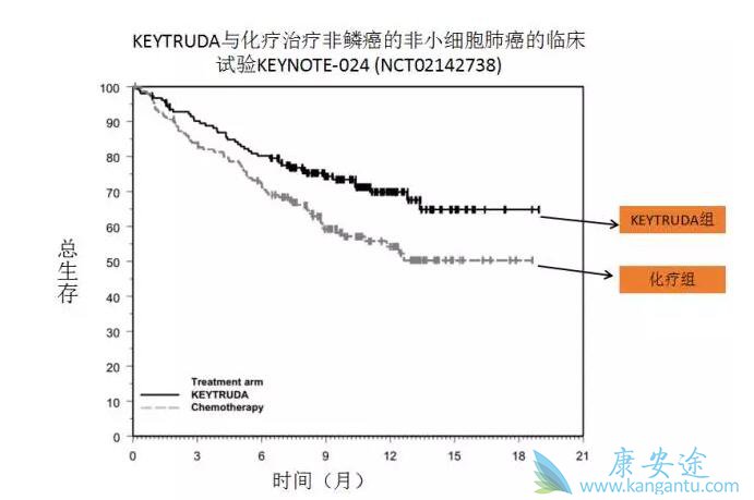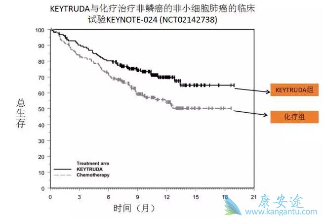 从上面数据图可以看出,KEYTRUDA组患者较化疗组的OS(总生存期)延长。